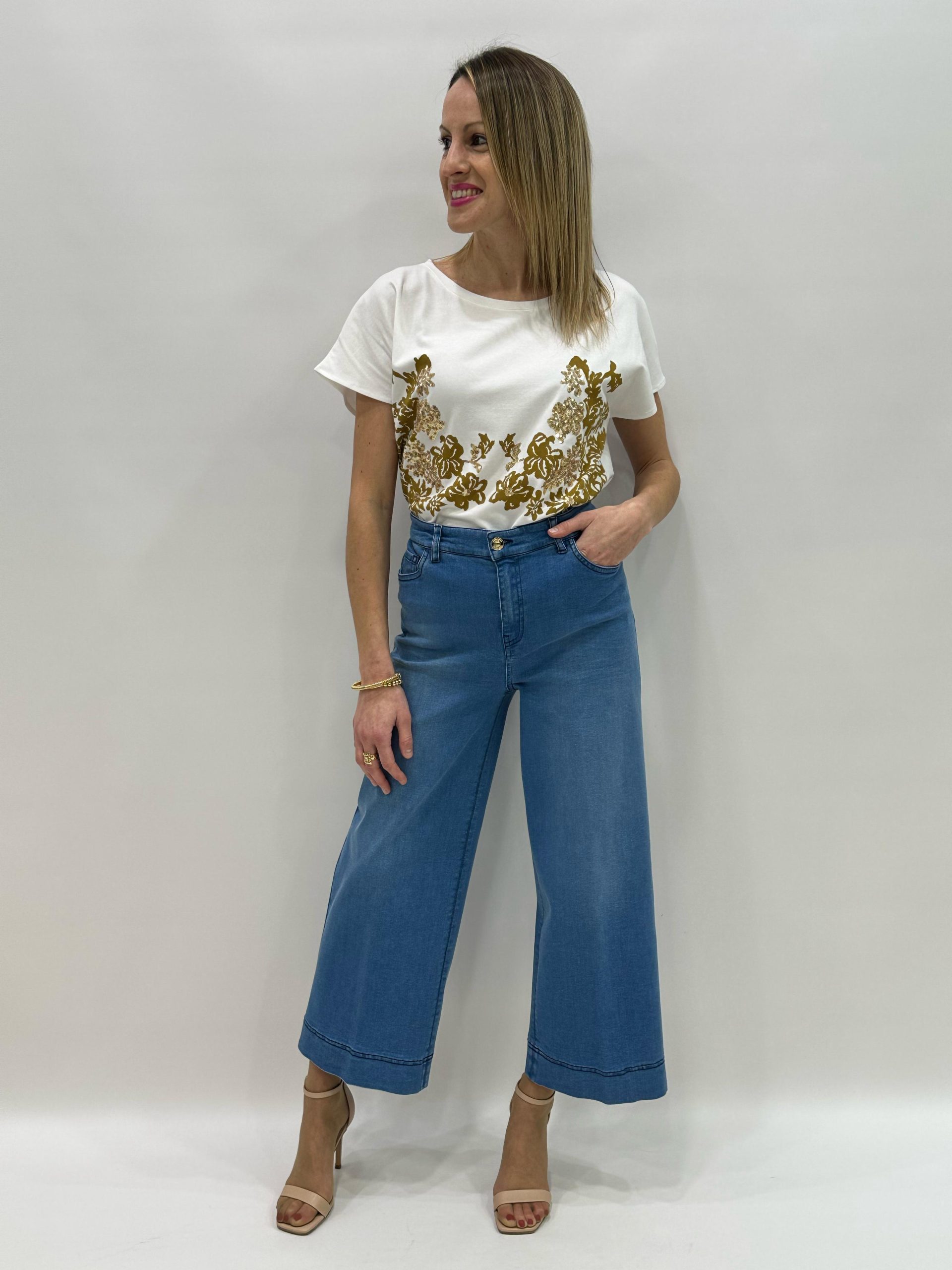 Descubre la elegancia y sofisticación de esta camiseta estampada de ALBA CONDE, perfecta para añadir un toque de estilo a tu guardarropa. Esta prenda de alta calidad está confeccionada con materiales suaves y duraderos que garantizan comodidad y frescura durante todo el día. El diseño presenta un estampado floral en tonos dorados que aporta un aire chic y moderno, ideal para combinar con tus piezas favoritas, ya sea en un look casual o más formal.