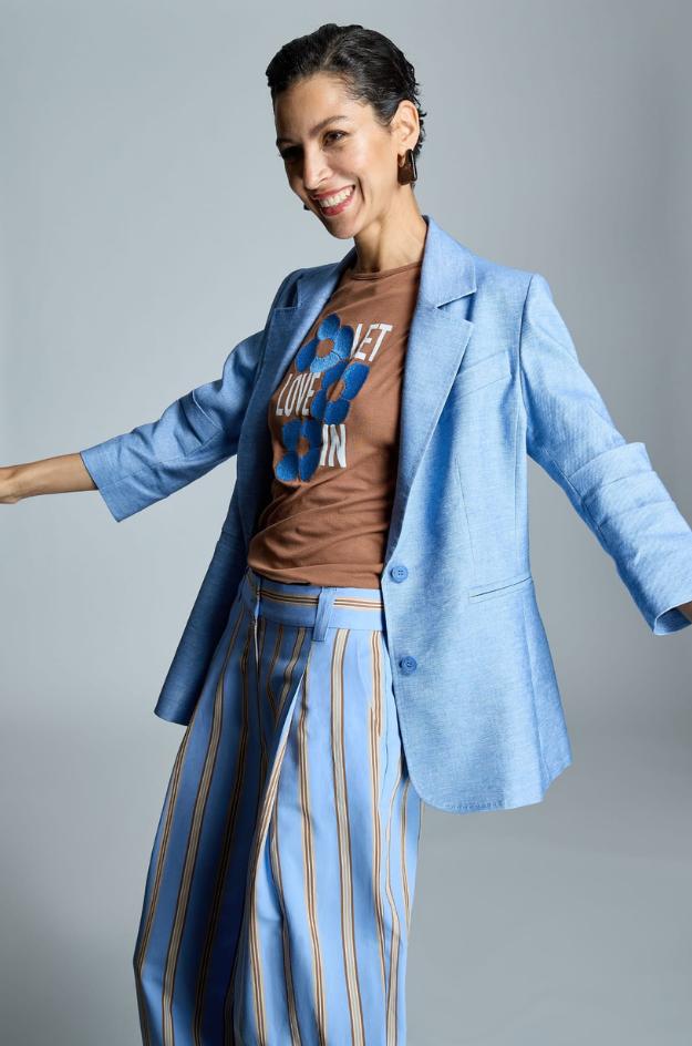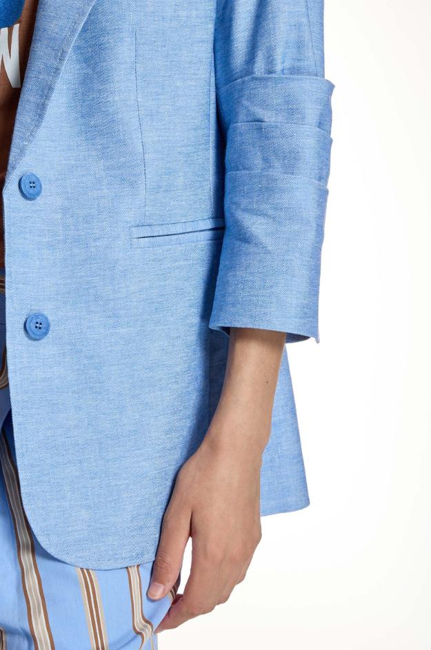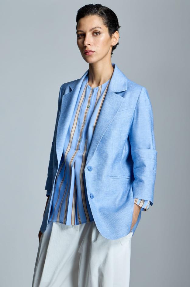 Chaqueta Alba Conde tipo americana en azul claro jaspeado, con un tejido de aspecto natural donde se aprecia la textura del lino. El corte es recto y ligeramente largo, con hombro definido y solapa clásica que enmarca el escote cuando se lleva abierta. En el delantero se ve un cierre con botón a la altura de la cintura y bolsillos integrados que mantienen una línea limpia. La manga es larga y, por la construcción del puño, permite llevarla remangada para un acabado más relajado. Es una prenda pensada para entretiempo y días templados, con presencia y sin exceso de grosor. Funciona muy bien sobre camisetas de algodón, tops de punto fino o blusas, y combina con denim, blancos, marino o tonos arena.