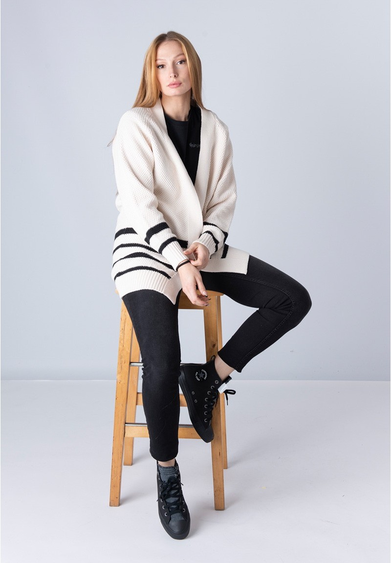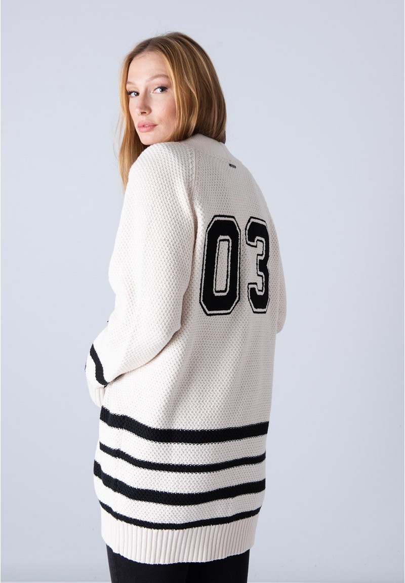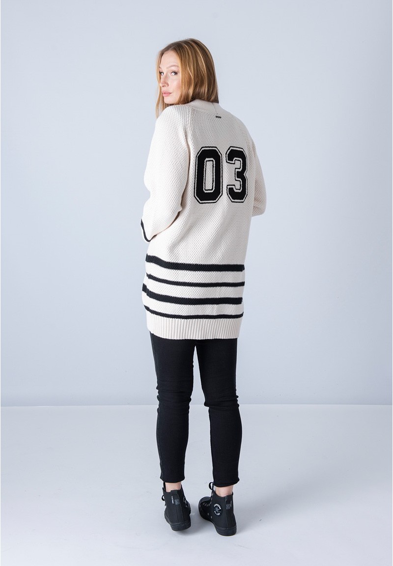 Chaqueta de punto con rayas horizontales en el bajo y el número 03 en la espalda. Es preciosa, es versátil y tiene mucho significado: 03 es el mes de marzo. Más allá del 8M, ya en muchos países, el mes de marzo está dedicado a honrar la contribución de las mujeres a los acontecimientos que han definido la historia del mundo.