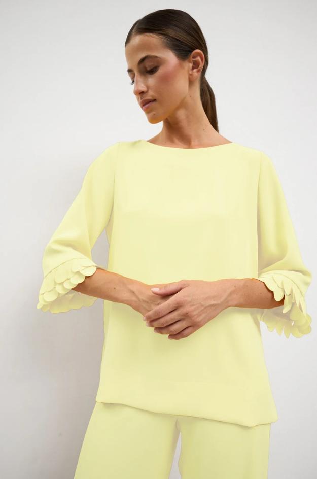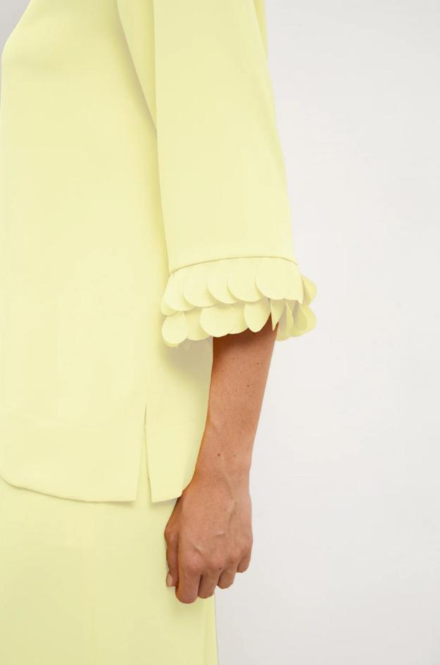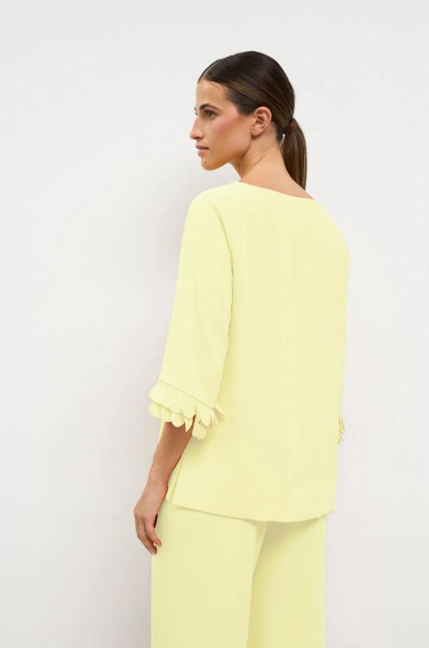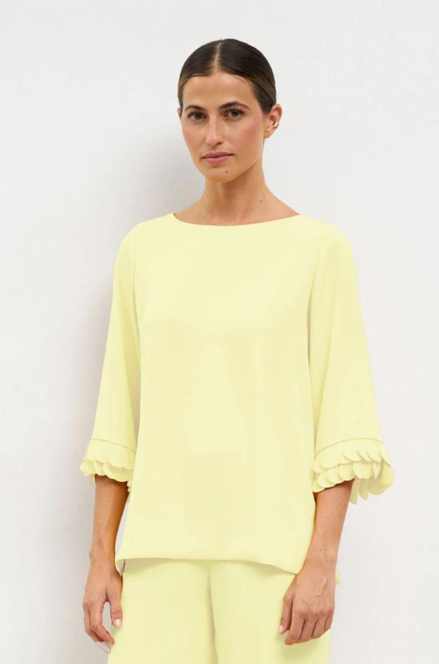 Conjunto Bariloche de top y pantalón en color amarillo suave, confeccionado en 96% poliéster y 4% elastán. El top lleva escote barco, manga francesa y detalle festoneado en los puños. El pantalón es largo, de pernera ancha y caída recta, creando una silueta limpia y muy elegante.
