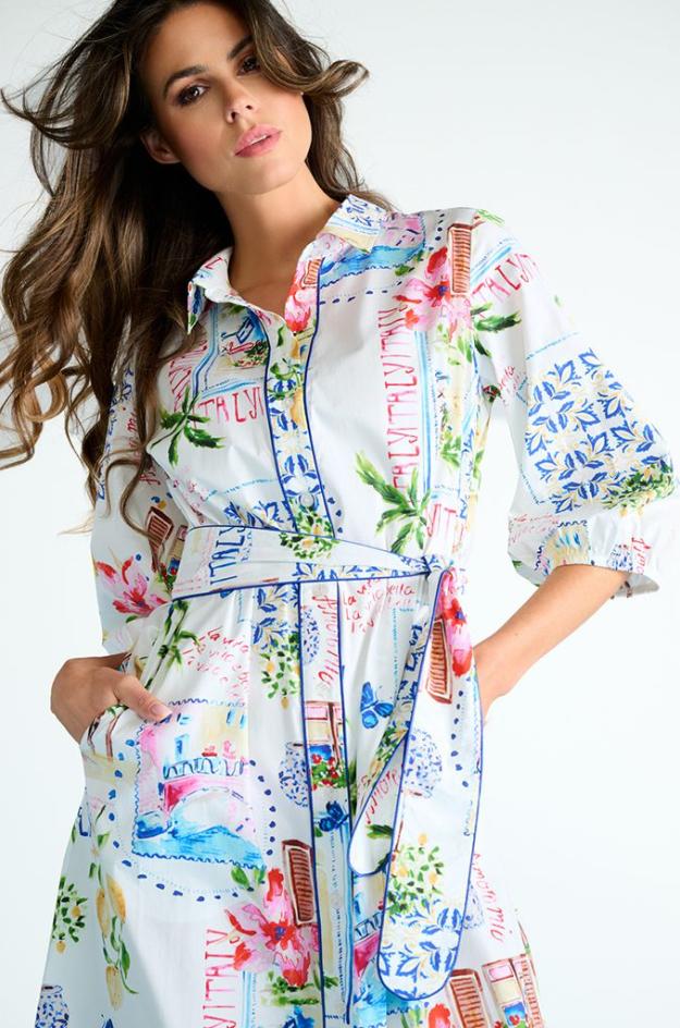 Vestido camisero de K-Design confeccionado en 97% algodón y 3% elastán, con un tejido agradable, ligero y con un pequeño punto de elasticidad que aporta más comodidad al llevarlo. Su estampado multicolor sobre fondo blanco combina flores, motivos tropicales y detalles inspirados en viajes, dando como resultado una prenda muy vistosa, alegre y diferente.