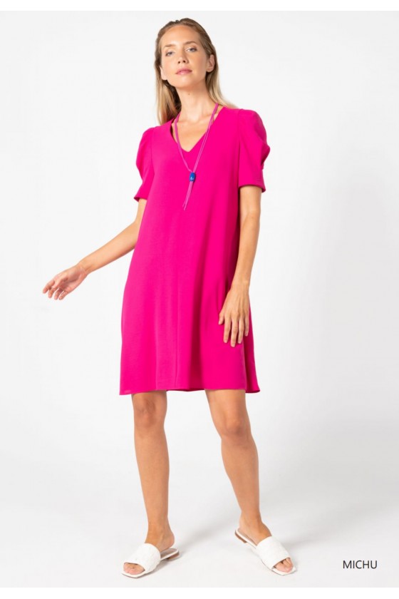 Vestido corte evasé de Tinta & Bariloche color fucsia, con escote pico y manga abullonada.
