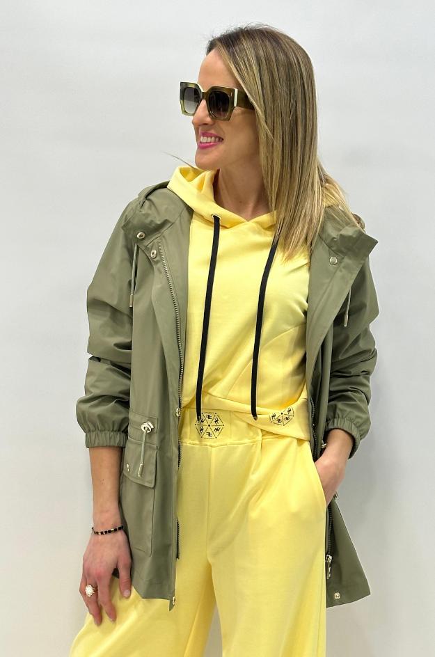 Lleva bolsillos delanteros amplios, combinando bolsillos de solapa y bolsillos laterales, aportando comodidad y un aire casual muy favorecedor. En la cintura incorpora cordones decorativos y funcionales que permiten ajustar ligeramente la prenda y dar forma a la silueta. Las mangas tienen puño fruncido, un detalle que refuerza su estilo desenfadado y cómodo. Es una chaqueta perfecta para entretiempo, muy ponible y pensada para acompañar looks informales con un punto cuidado.