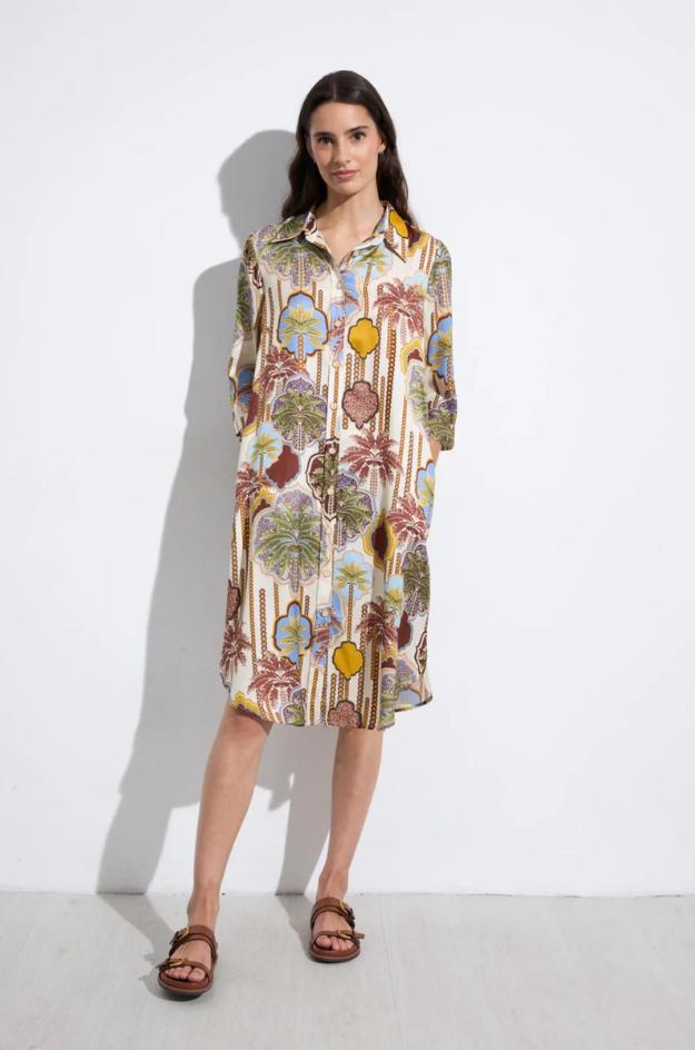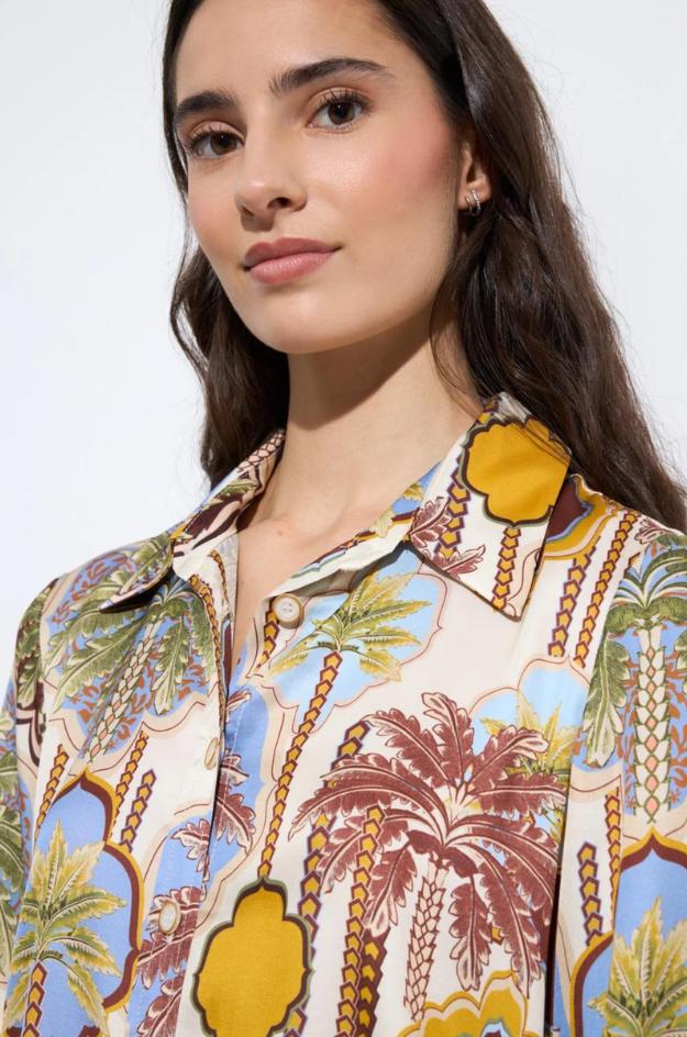 El gran protagonista es su estampado ornamental, combinado en tonos tierra, azul, verde y mostaza sobre fondo claro, con un dibujo muy visual que aporta carácter sin perder armonía. Puede llevarse como vestido por sí solo o abierta a modo de sobrecamisa, superpuesta sobre pantalones, tops o vestidos lisos. Es una prenda muy versátil, pensada para sacar partido tanto en looks de diario como en combinaciones más especiales.