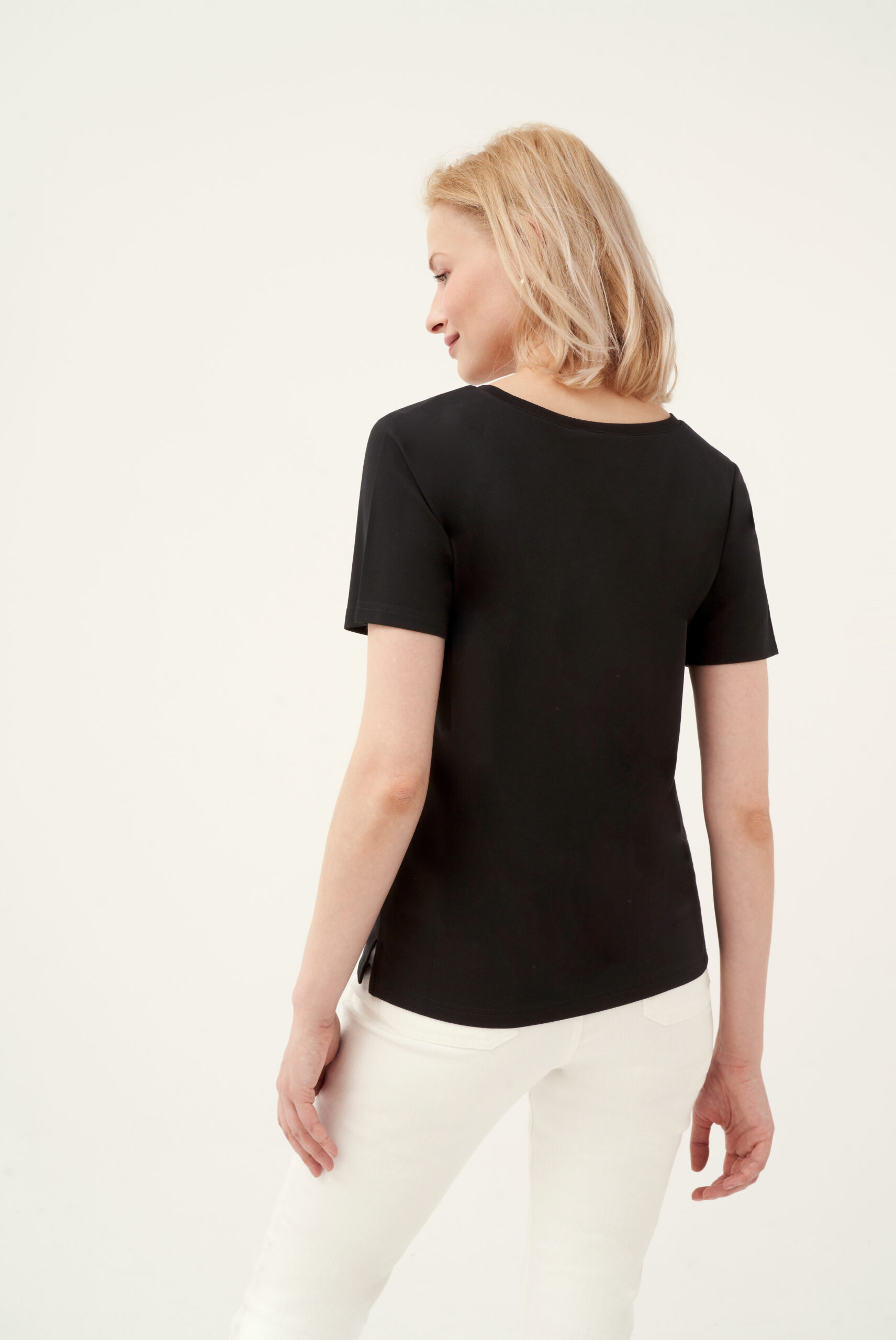 Camiseta de manga corta y cuello redondo de LEO & UGO color negro. Detalle de dibujo de bailarinas en la parte delantera. Aberturas laterales.