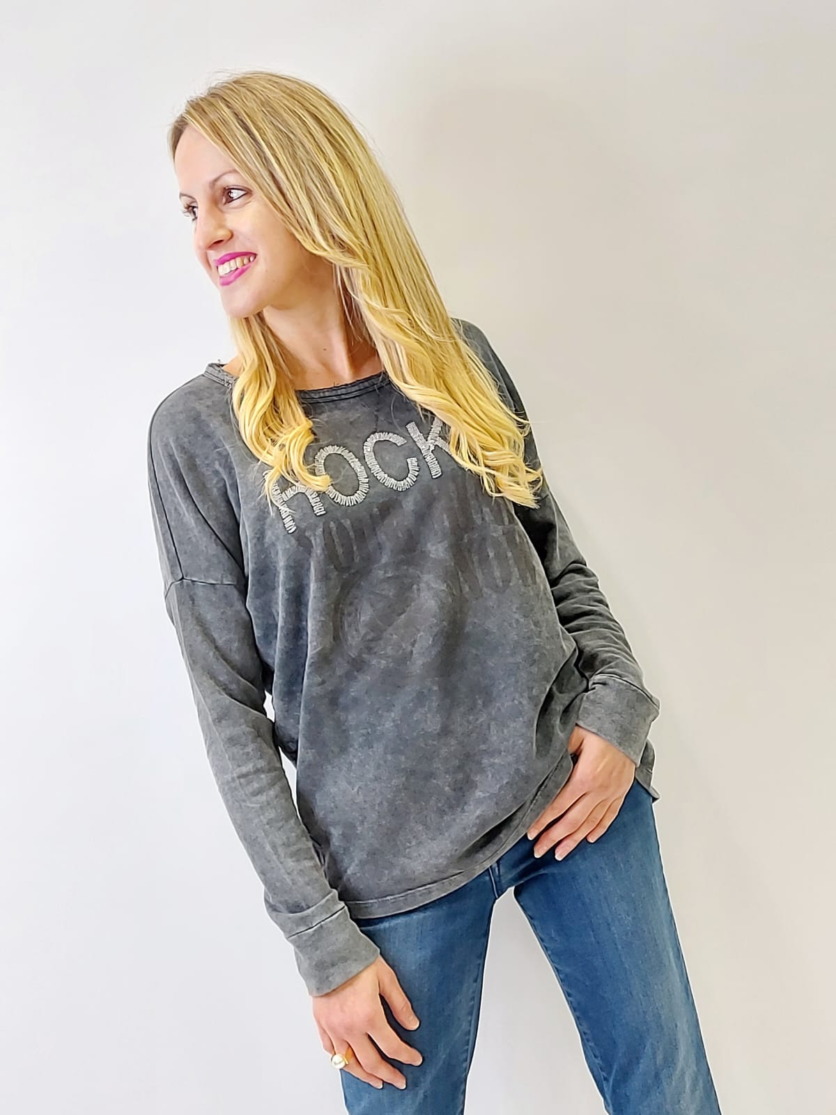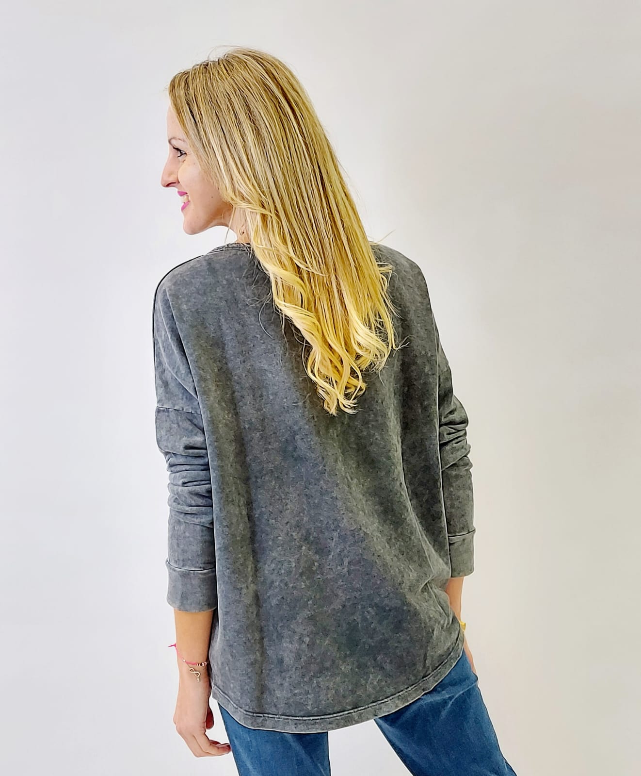 Sudaderda de punto fino con corte amplio, escote redondo y manga larga de Monari. Detalle de dibujos en la parte delantera.