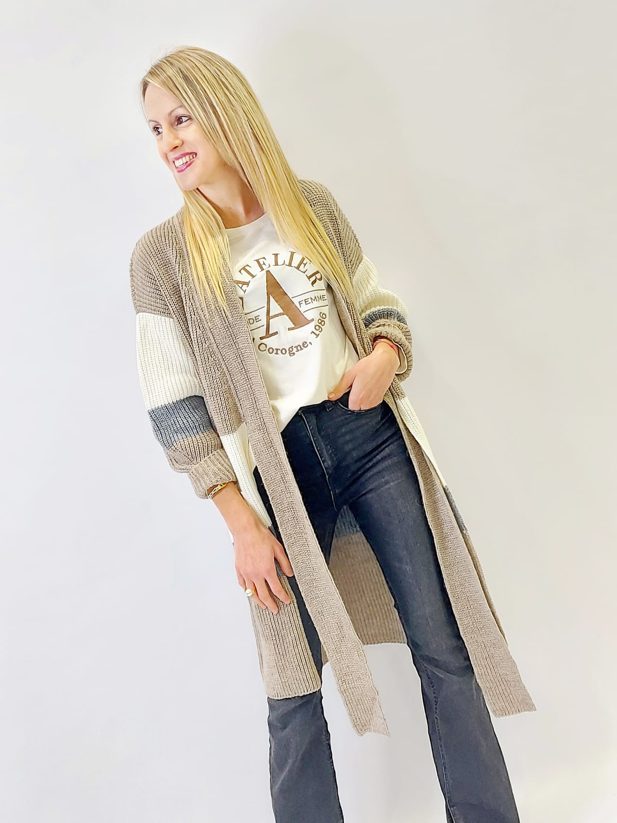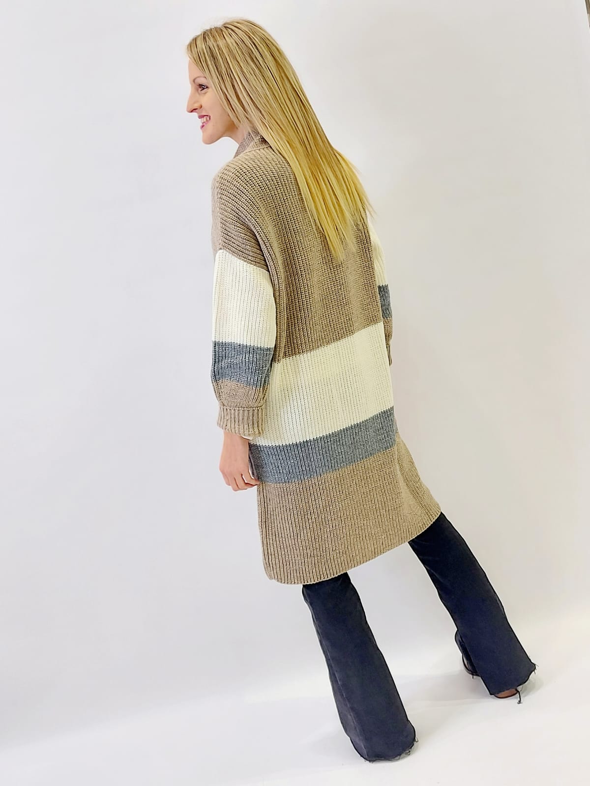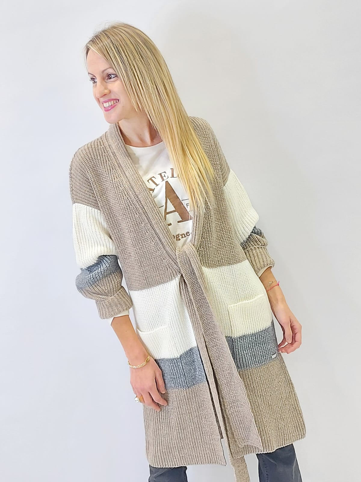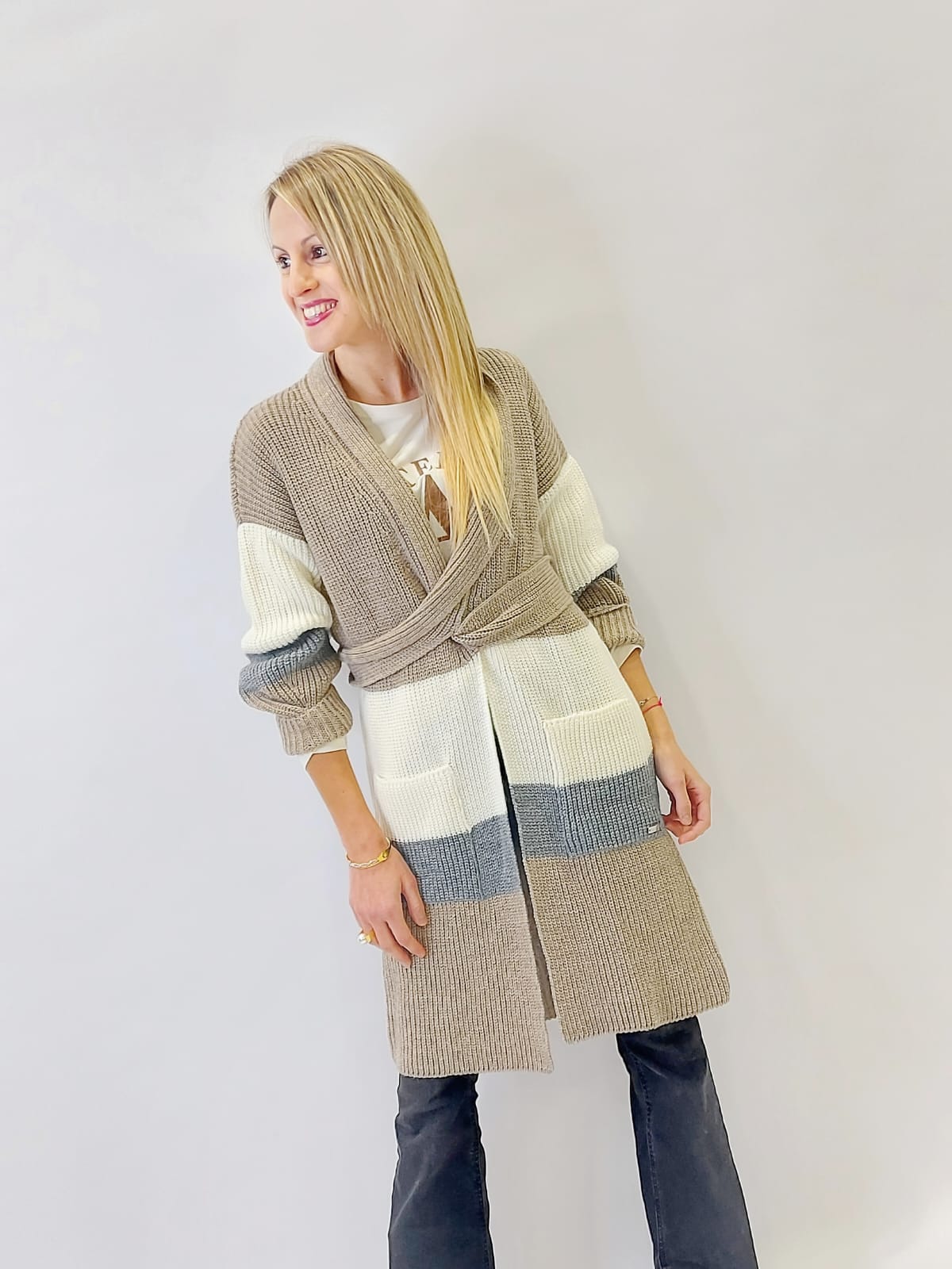 Chaqueta larga de punto de Alba Conde con detalle de cierre con lazada en el centro delantero. Diseño de manga larga, bolsillos de plastón laterales y bajo recto.