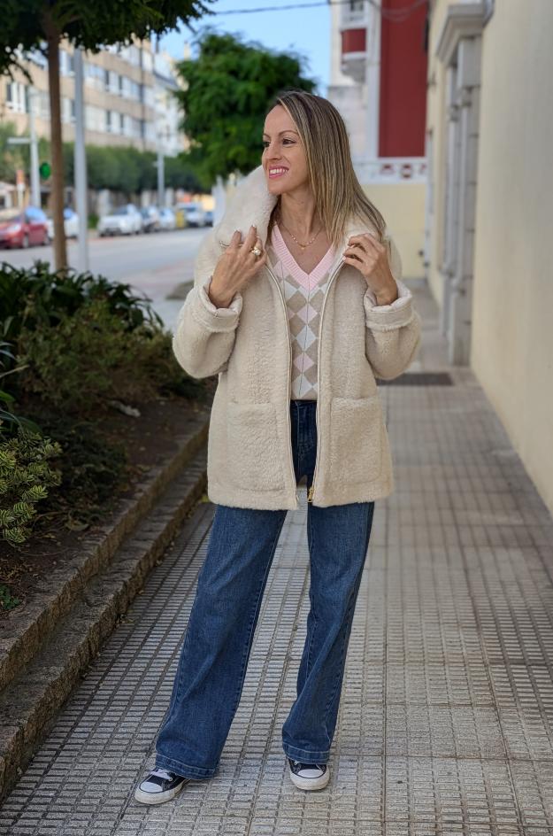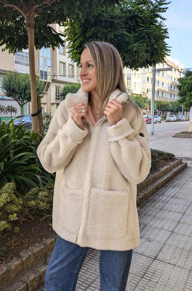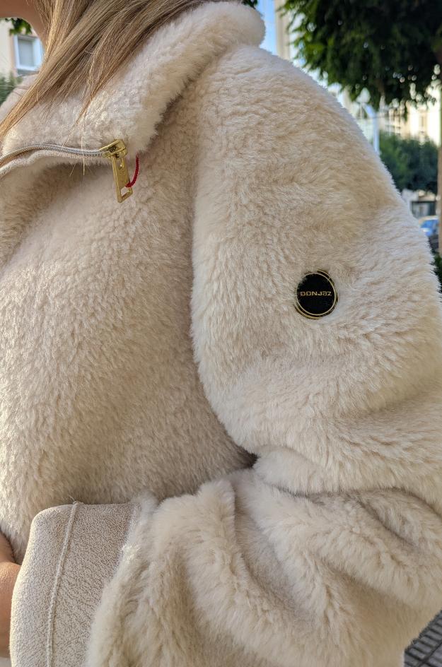 Chaqueta de Donjaz confeccionada en borreguito/pelo sintético de tacto muy suave y color crudo. Presenta capucha envolvente, cierre central de cremallera visible, manga larga con vuelta sencilla y dos bolsillos de plastrón de gran formato en el delantero. El patrón es recto, con bajo limpio y largo medio que cubre la cadera. Interior forrado para facilitar la superposición.