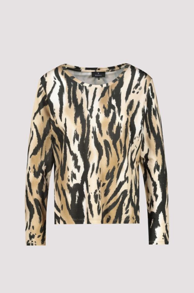 Camiseta Monari confeccionada en punto liso de viscosa y modal con elastano, de tacto suave y elasticidad confortable. Presenta escote redondo limpio, hombro clásico, manga larga y silueta recta que cae a la cadera; bajo y puños con remate sencillo y costuras al tono. El motivo animal print tipo tigre se interpreta en trazos fluidos sobre una base clara combinando caqui, arena y negro. Prenda ligera y adaptable que acompaña el movimiento sin ceñir. Composición: 45% viscosa, 45% modal, 10% elastano.