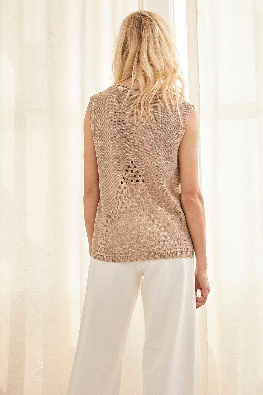 ¡Top de punto Nekane en color camel con escote y espalda calados! Presenta manga sisa y escote redondo. Una opción elegante y versátil para cualquier ocasión.