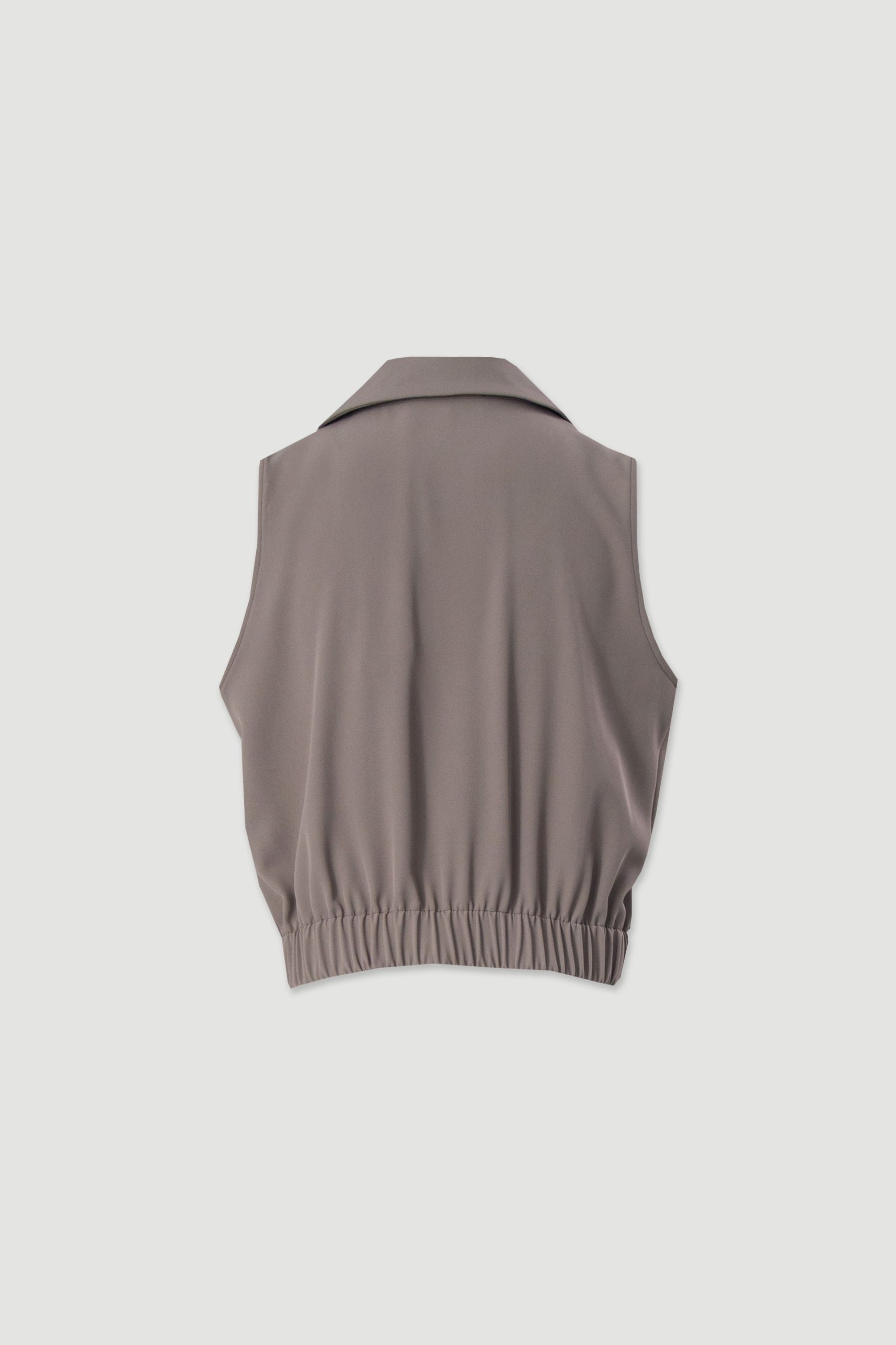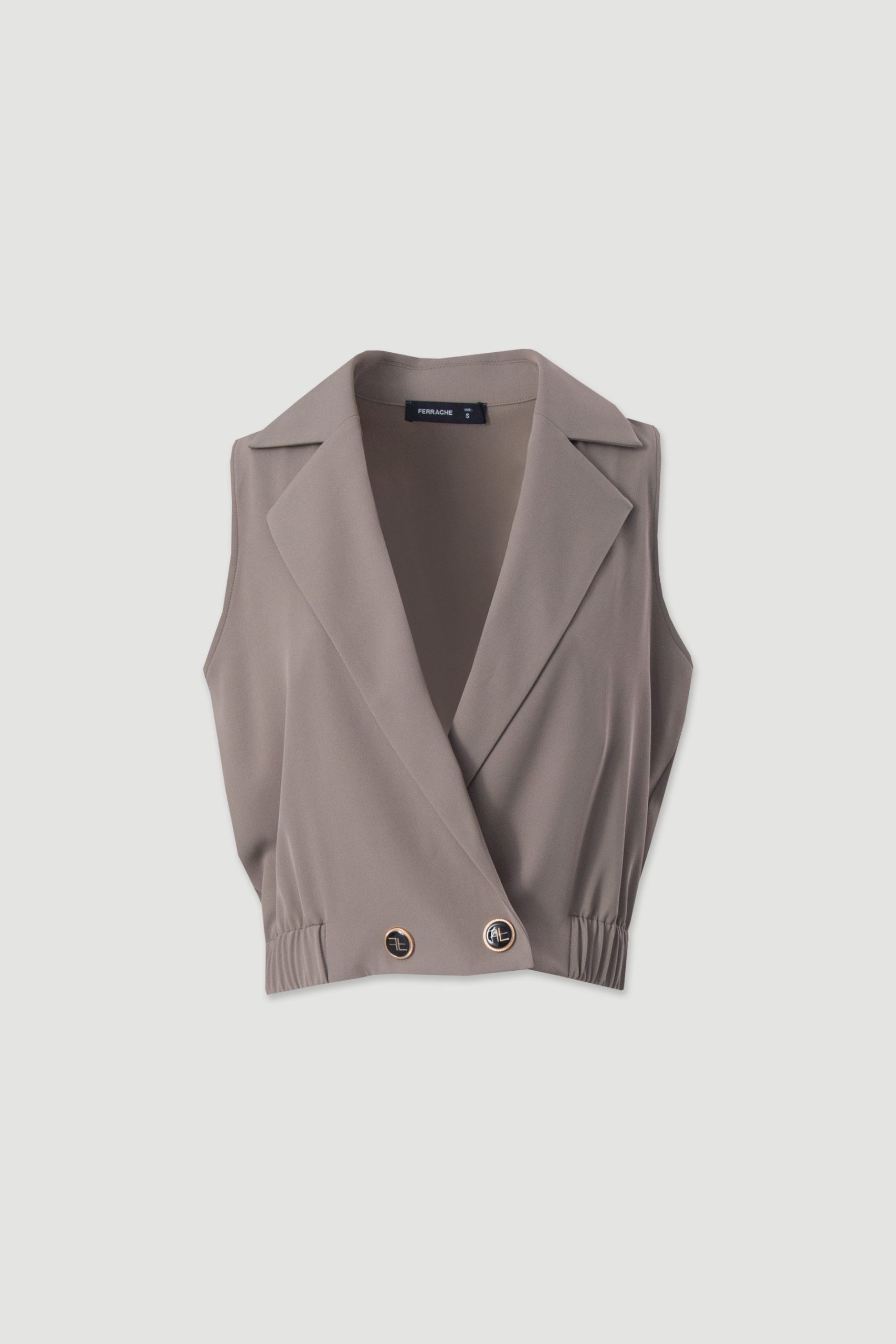 Top corto cruzado sin mangas con escote en V, solapa tipo blazer y botones metálicos decorativos. La cinturilla elástica en la base asegura un ajuste cómodo y define la silueta. Versátil y sofisticado para looks elegantes o casual.