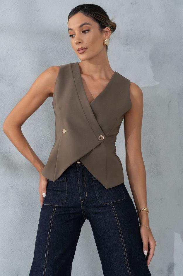 Chaleco corto y entallado, sin mangas, con escote en pico y cierre cruzado mediante dos botones metálicos. Delantero con bajo en picos y líneas estructuradas.