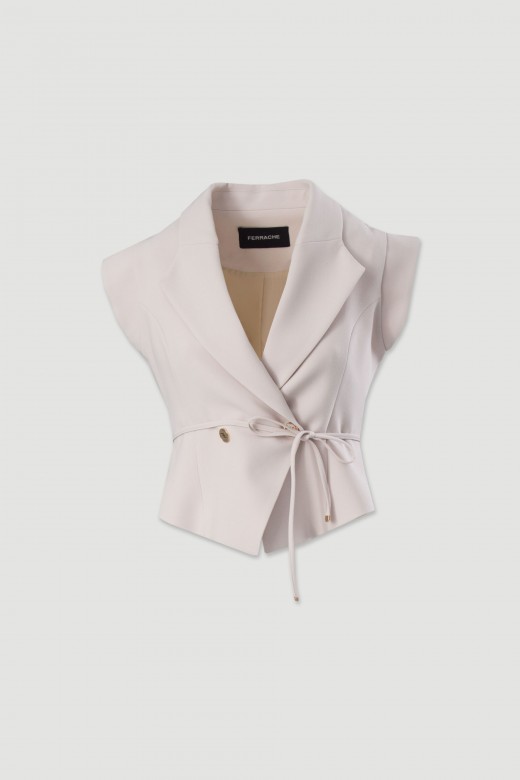 Chaleco cruzado con cuello de solapa y cinturón del mismo tejido que realza la cintura. Una prenda elegante y versátil para looks femeninos y actuales.