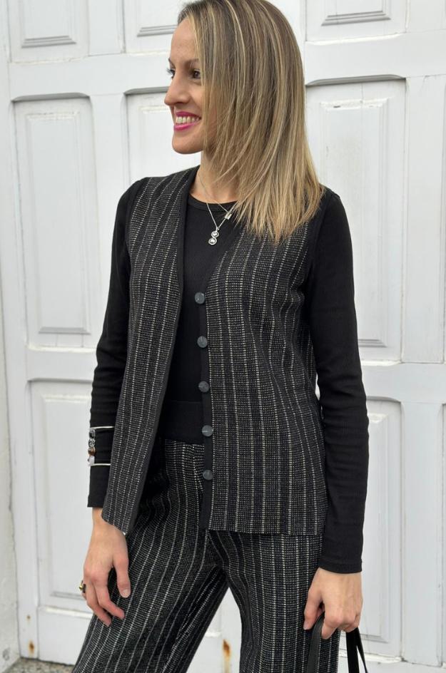 Chaleco bicolor Scorzzo confeccionado en punto jacquard con mezcla de viscosa, poliéster y poliamida. Presenta un diseño estructurado con rayas verticales en tonos negro y gris que estilizan la silueta. Incorpora escote en pico, cierre frontal con botones forrados y acabado recto a la cadera. Su tejido de punto elástico proporciona comodidad y un ajuste favorecedor, ideal para combinar con camisas o jerséis finos. Los acabados al tono refuerzan su aire elegante y contemporáneo.