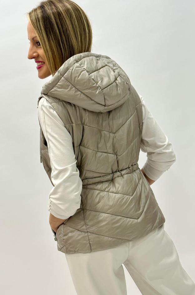 Chaleco acolchado en color gris perla con capucha ajustable, cierre delantero de doble cremallera y bolsillos con cremallera. Composición: 100% poliamida.