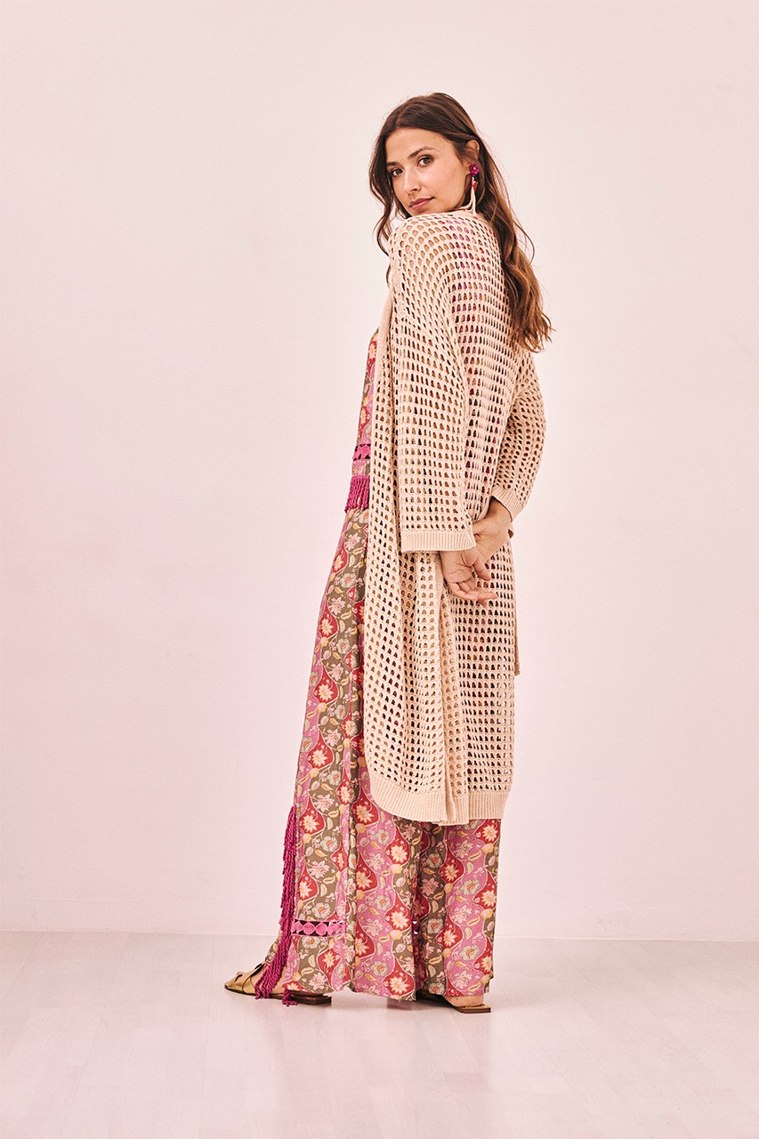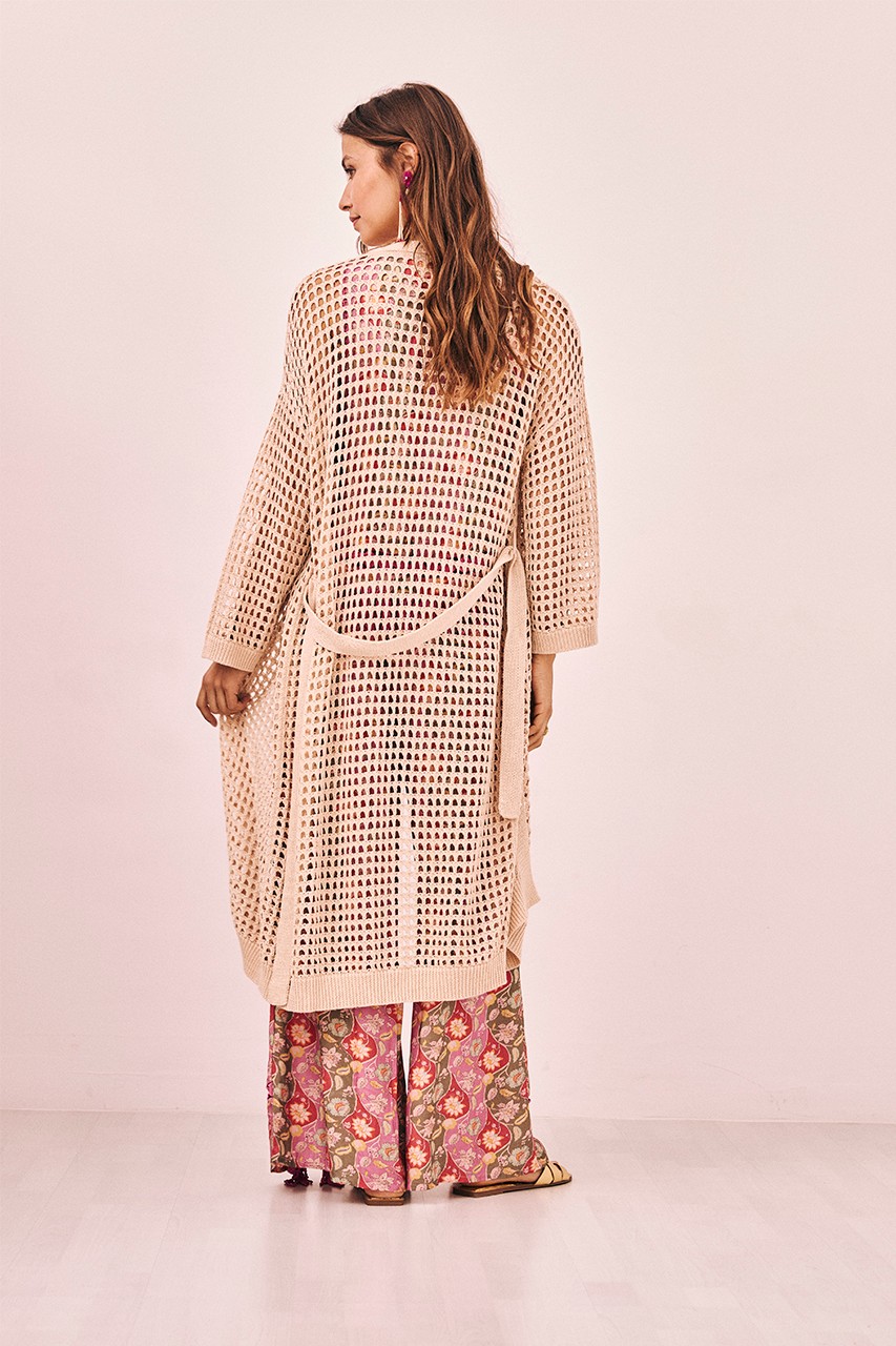Kimono largo de manga larga de punto con calados. Cierre con cinturón en la cintura. Empiece y acabado con tubular.
