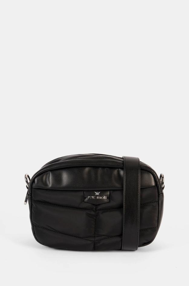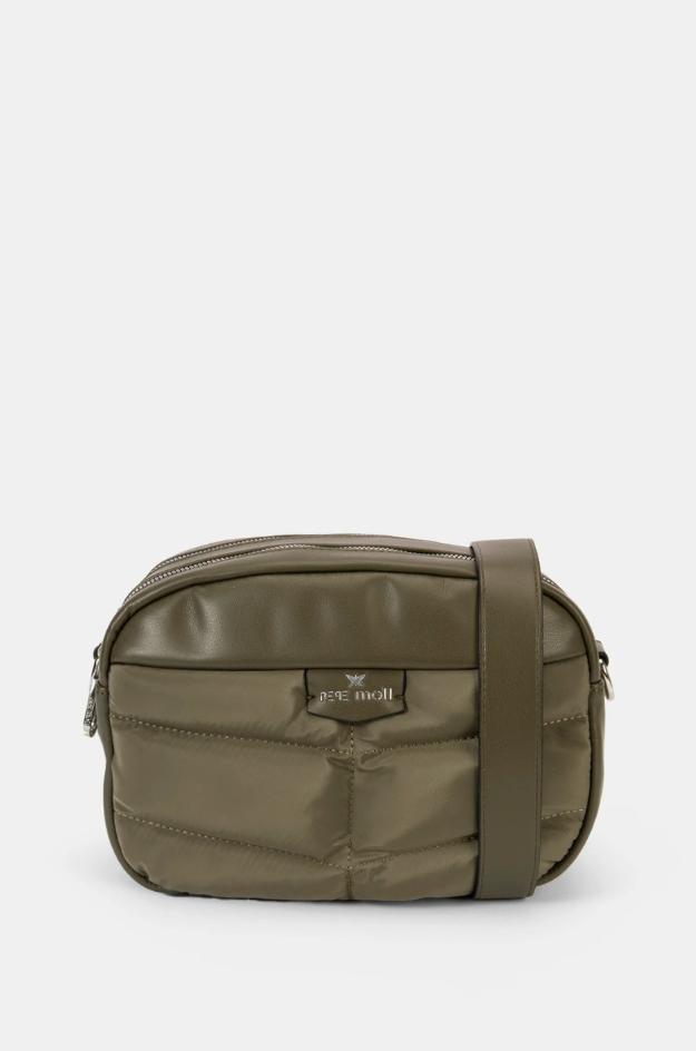 Bandolera Pepe Moll de tamaño medio realizada en material técnico acolchado con acabado satinado y panel superior liso que estructura la boca del bolso. Presenta silueta compacta con cremallera superior de apertura amplia, correa ancha ajustable para llevar al hombro o cruzado y placa con logo en el frontal. El fondo de 12 cm aporta estabilidad y capacidad para los imprescindibles diarios (cartera, móvil, llaves, gafas). Interior forrado con terminaciones al tono. Disponible en verde, negro y granate. Medidas: 18 × 27 × 12