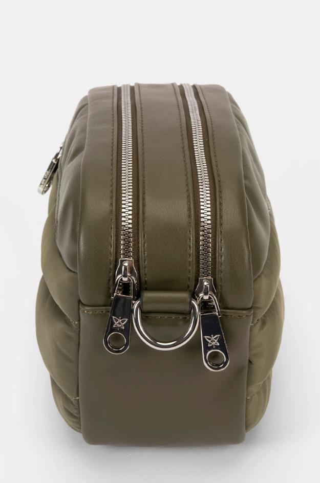 Bolso bandolera de formato rectangular con esquinas redondeadas, combinación de tejido técnico acolchado y pieza lisa símil piel. Cierre superior con cremallera, bandolera ancha regulable y chapa metálica con logo. Colores: verde, negro y granate. Medidas: alto 18 cm · ancho 27 cm · fondo 12 cm.