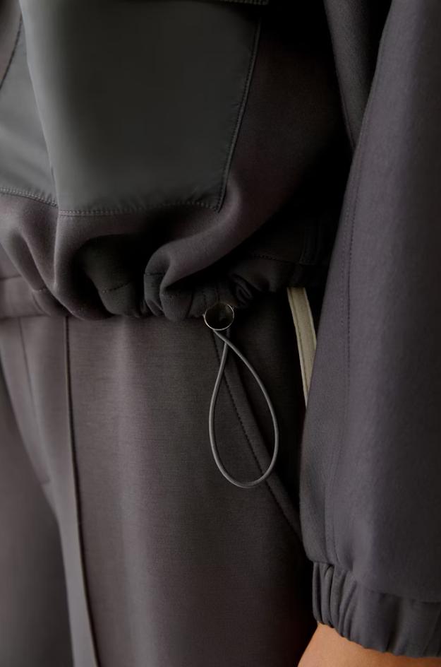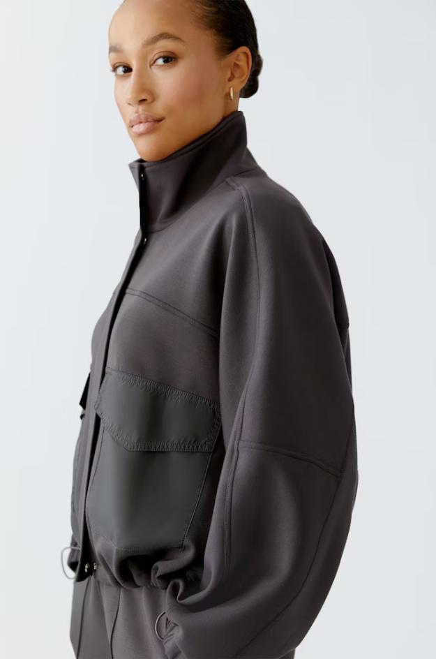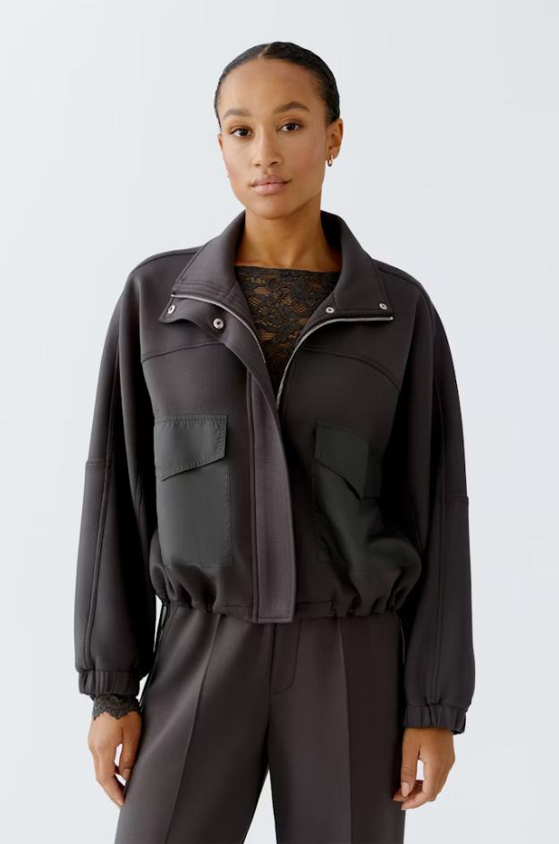 Chaqueta en tejido scuba (exterior con aspecto neopreno e interior tipo jersey, tacto suave). Corte oversize y largo regular (referencia: 58 cm en talla 36). Cuello alzado con tapeta de botones a presión y cremallera oculta. Delantero con bolsillos de parche con tapa confeccionados en nailon. Cintura con cordón ajustable rematado en piezas metálicas. Puños con acabado fruncido.