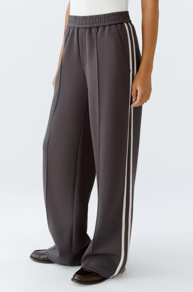 Conjunto en gris compuesto por chaqueta en tejido scuba con cuello alzado, cremallera oculta, automáticos y bolsillos de parche en nailon; y pantalón de pernera ancha con raya planchada y cintura lisa. Tejido principal mezcla poliéster-viscosa-elastano; detalles en poliamida.