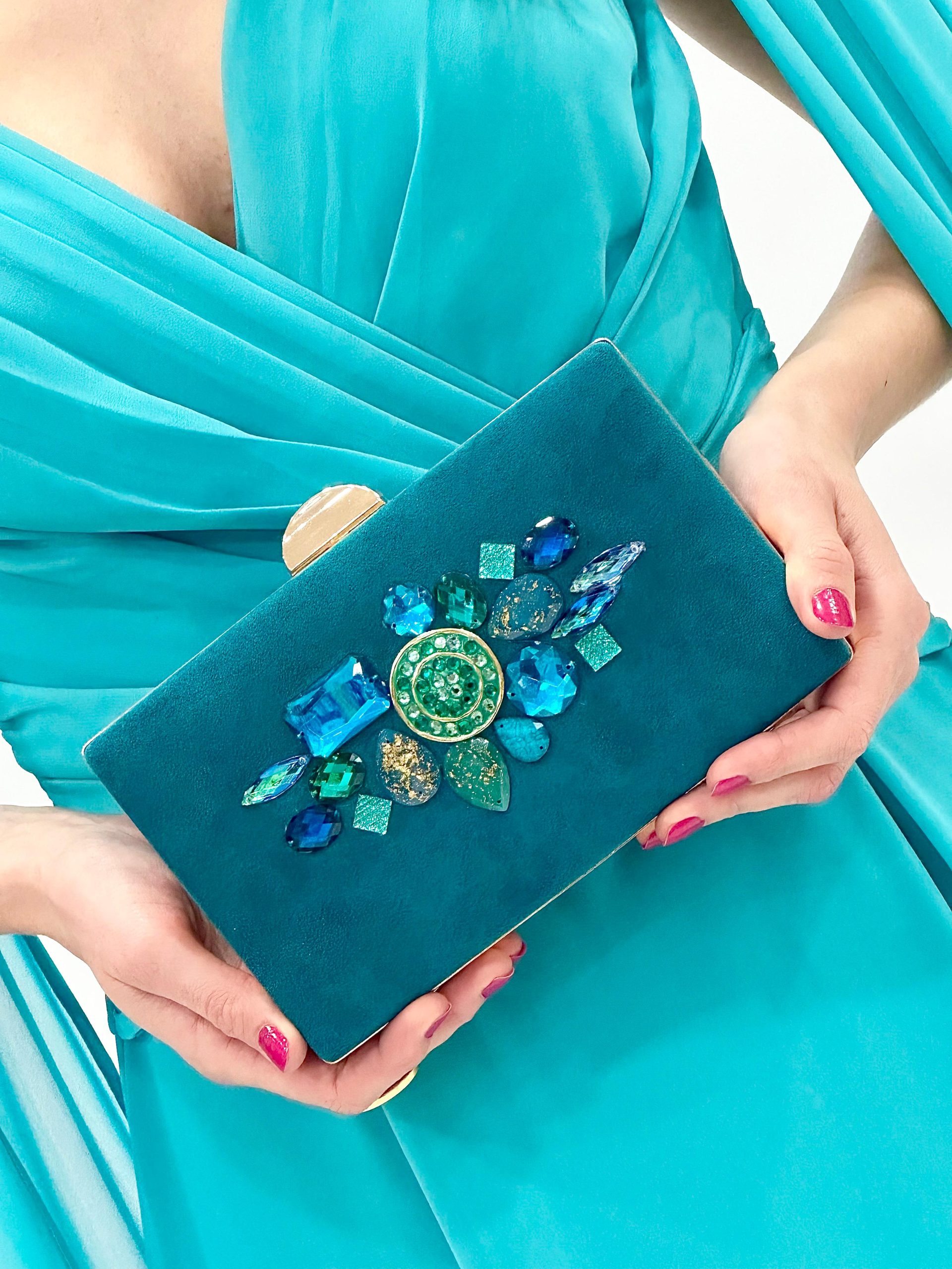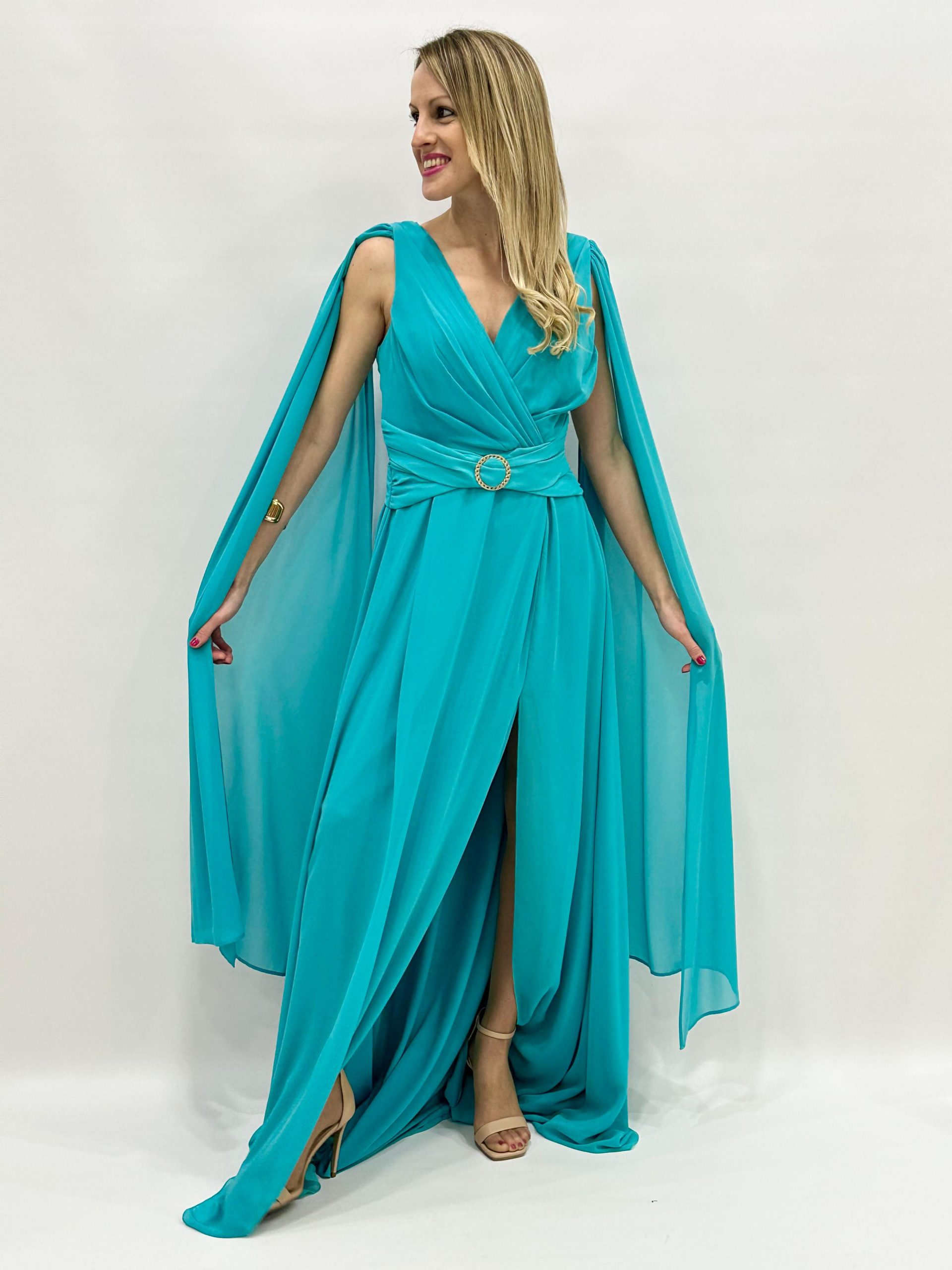 Descubre la elegancia y el encanto de nuestro vestido largo de fiesta de Juan Marcos. Confeccionado en tejido de gasa en un delicado tono verde agua, este vestido es ideal para cualquier ocasión especial.