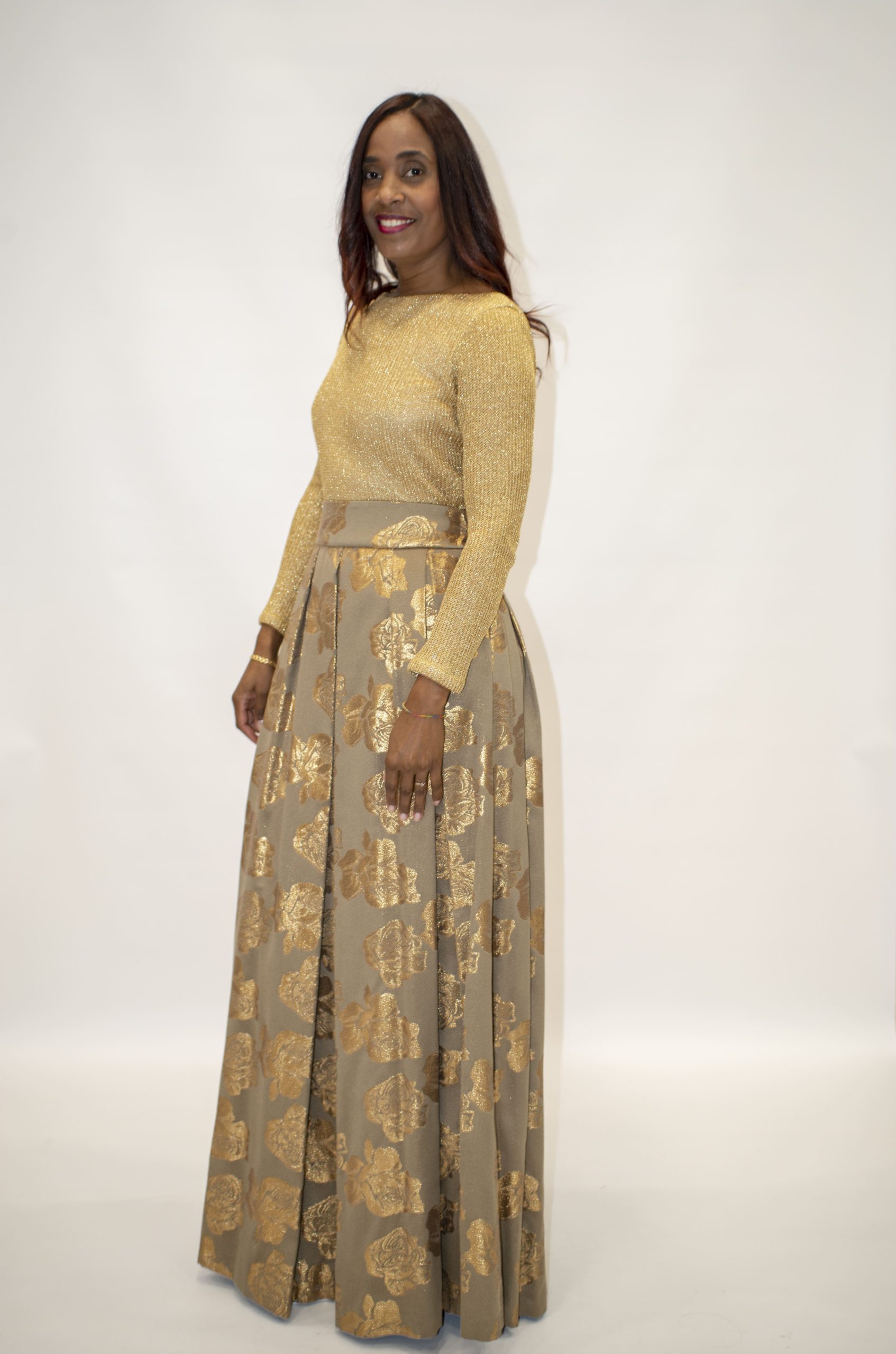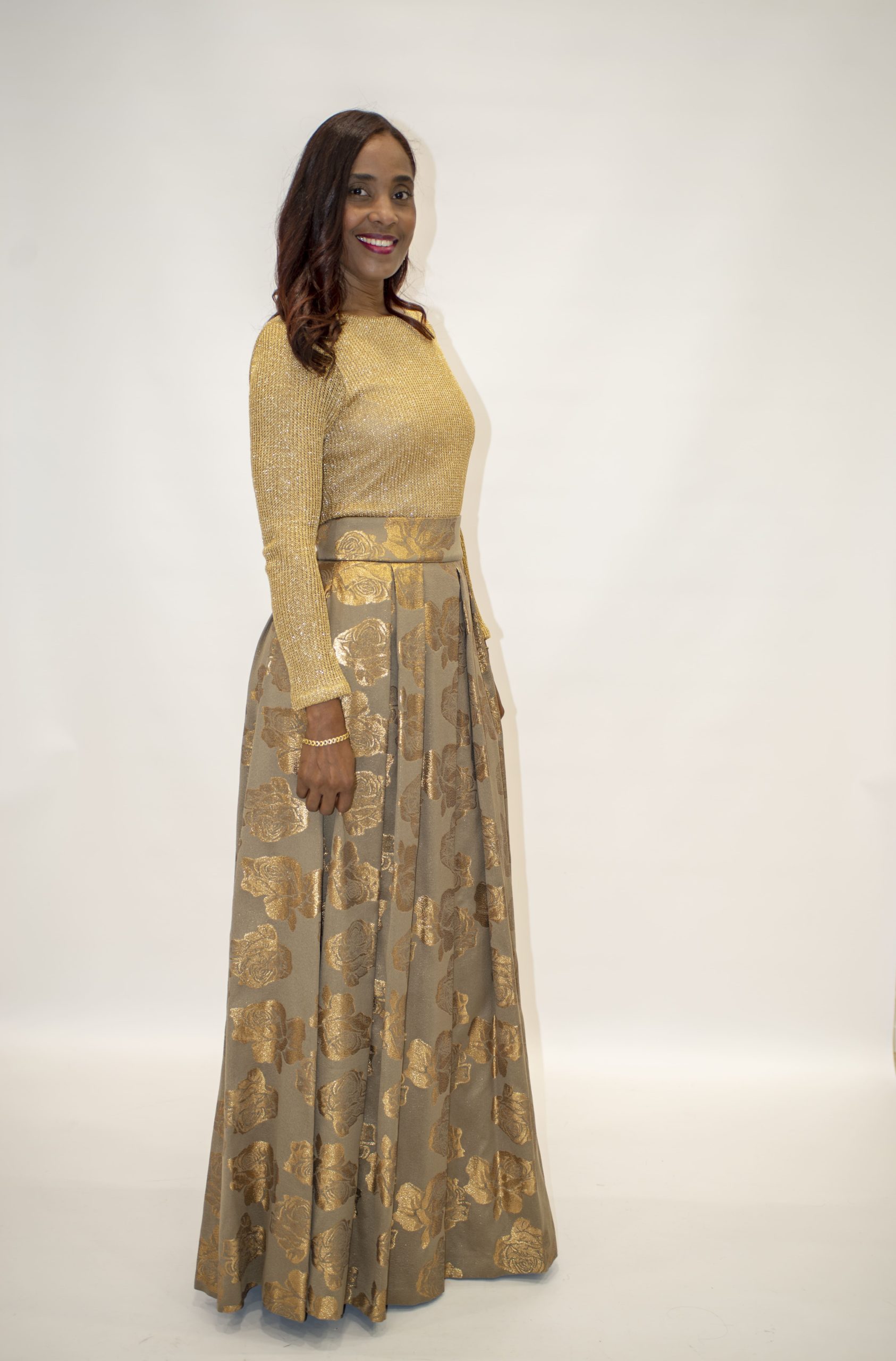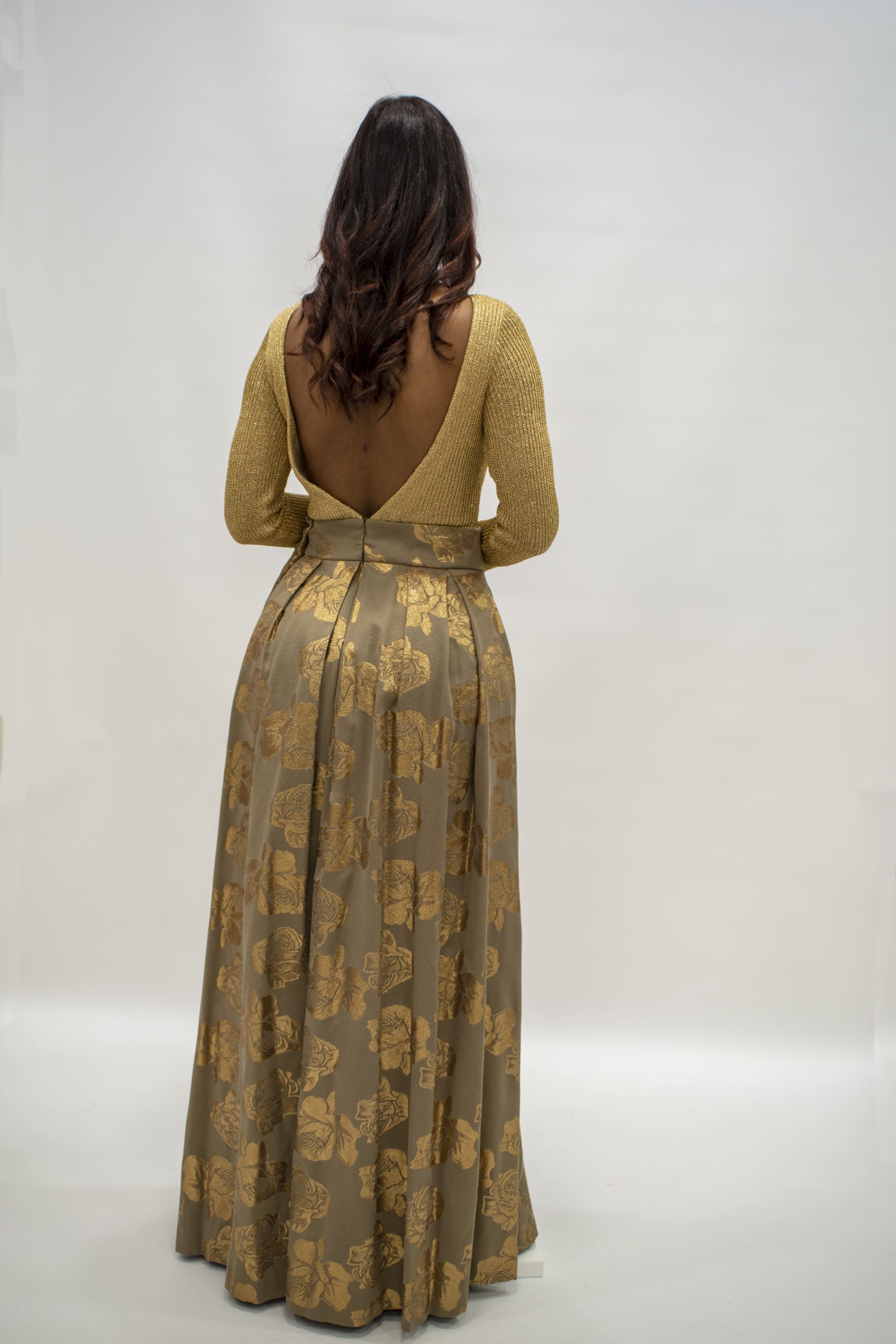 Este impresionante vestido largo de fiesta de Nuribel combina elegancia y sofisticación en cada detalle. Con un corte favorecedor en la cintura, el cuerpo de punto entallado en color dorado presenta un escote en pico y manga larga, realzando la figura con estilo. La abertura en la espalda aporta un toque sensual y moderno. La falda larga, confeccionada con elegantes tablas en tonos topo y dorado, crea un hermoso vuelo que añade movimiento y majestuosidad al diseño. Perfecto para eventos especiales, este vestido es una elección que destaca por su glamour y distinción.