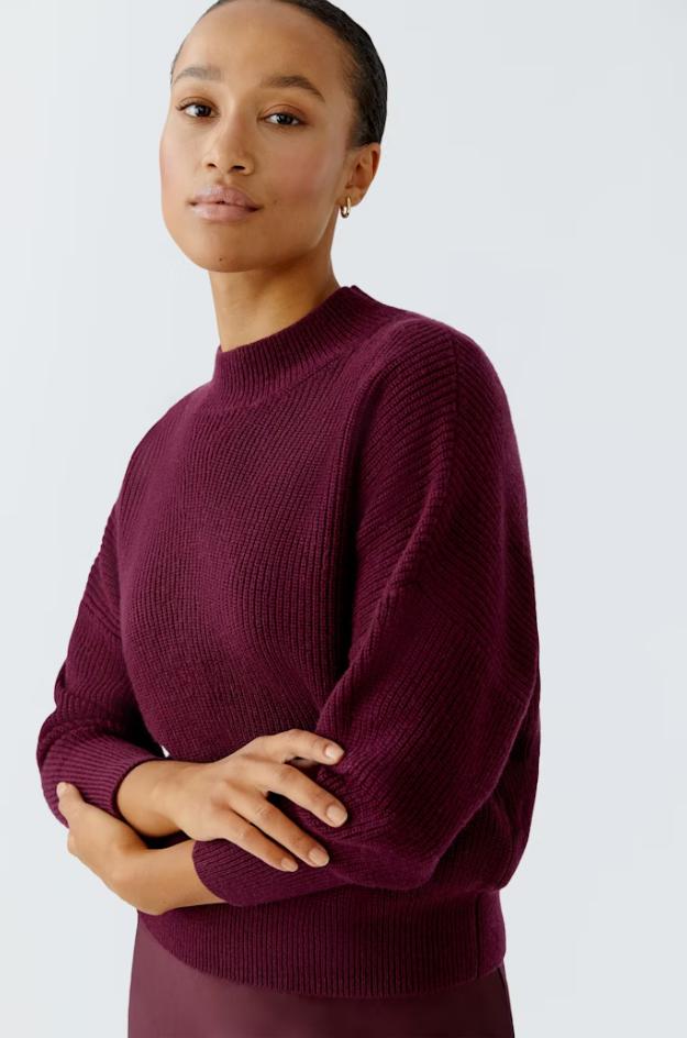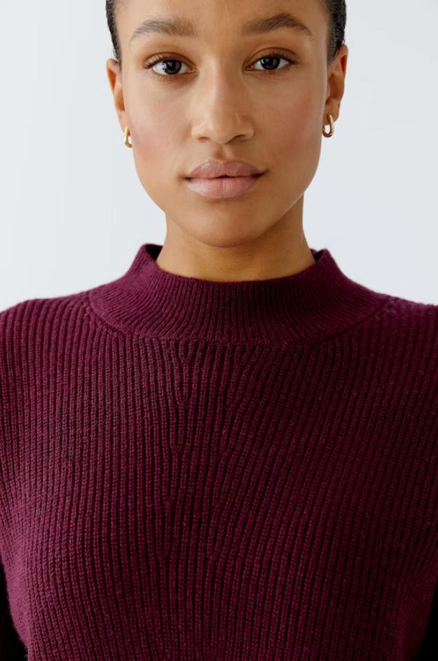Jersey en color burdeos de punto acanalado con cuello redondo de canalé alto, hombro muy caído y manga 7/8 terminada en puño ancho. Silueta oversize que se entalla hacia el bajo.