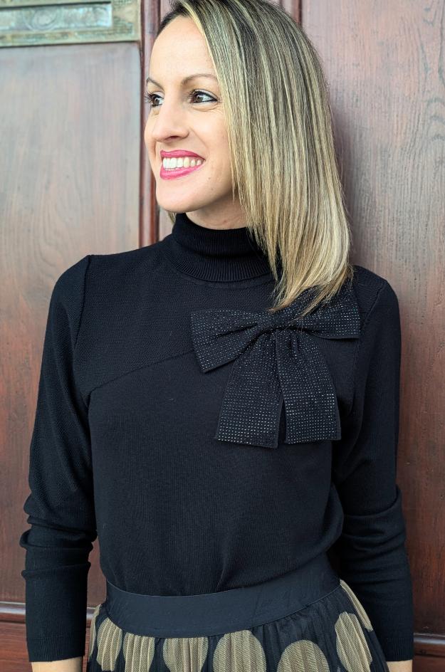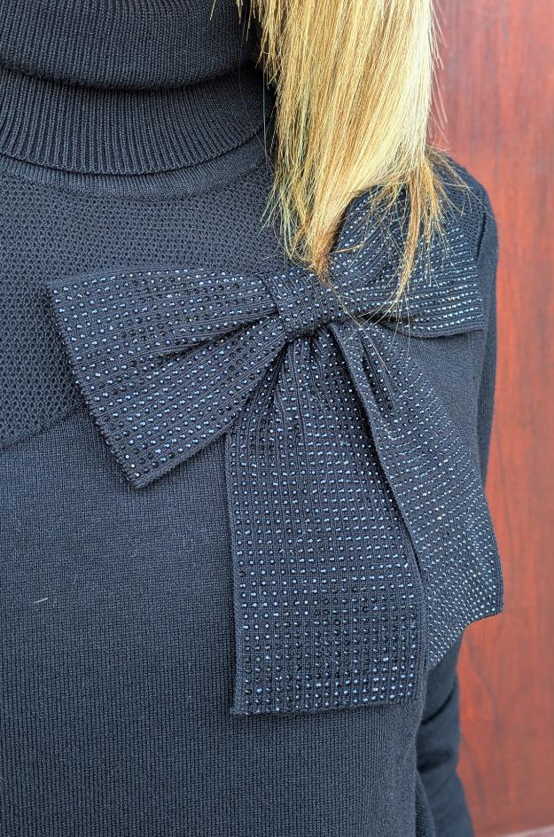 Jersey negro de punto fino con cuello perkins y manga larga. Lleva un lazo aplicado con microbrillos en el hombro que cruza el pecho con una pieza de punto en diagonal. Largo a la cadera y ajuste cómodo.