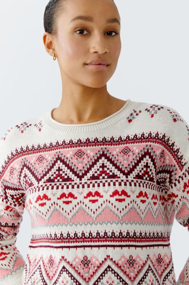 Suéter de Ouí tejido en punto jacquard de algodón. Presenta silueta relajada con longitud recortada y cuello redondo acabado en canalé con borde estrecho enrollado. El hombro caído da paso a mangas largas; puños y dobladillo rematados en canalé para mantener la forma. El dibujo noruego recorre cuerpo y mangas en una paleta de crudo, rosas y burdeos con pequeños toques oscuros para contraste. Longitud de referencia: 52 cm en talla 36.