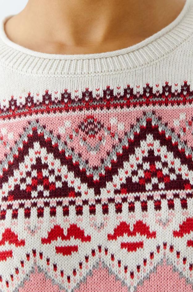 Jersey 100% algodón con jacquard tipo noruego en tonos rosa/burdeos sobre base cruda. Corte casual y largo corto, cuello redondo con rib y borde enrollado, hombro caído, manga larga, puños y bajo en canalé. Largo ref. 52 cm (talla 36).