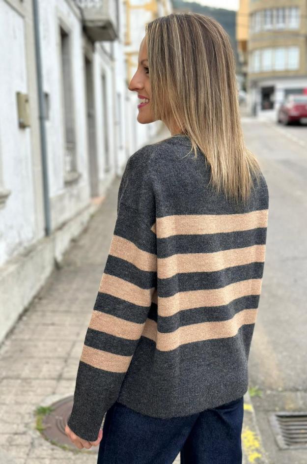 Jersey Monari confeccionado en punto fino de mezcla suave con tacto agradable. Presenta diseño de rayas horizontales en tonos gris antracita y beige, con detalle de logo central formado por pequeñas aplicaciones brillantes que aportan un toque luminoso. Incorpora cuello redondo, manga larga y puños rectos. Su silueta recta y caída natural crean un ajuste cómodo y favorecedor. Los acabados al tono refuerzan su estética contemporánea, perfecta para combinar con denim o pantalones de vestir.