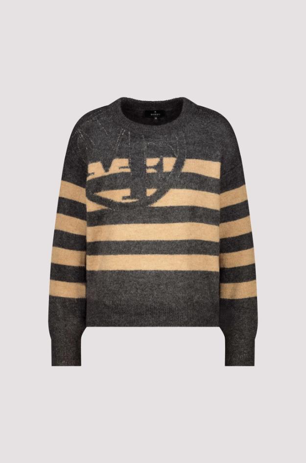 Jersey de rayas gris y beige con logo decorativo brillante, cuello redondo y manga larga, confeccionado en mezcla suave de Monari.
